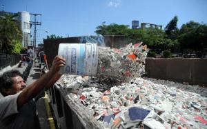 Un trabajador echa los restos rotos de la obra de arte a un contenedor de basura. (Foto prestada de Indignados por el mural: https://www.facebook.com/Indignadosporelmural)