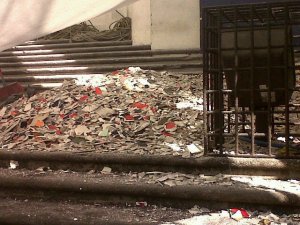 Mural hecho añicos del artista salvadoreño Fernando Llort, que adornaba la Catedral de San Salvador. (Foto prestada de Indignados por el mural: https://www.facebook.com/Indignadosporelmural)