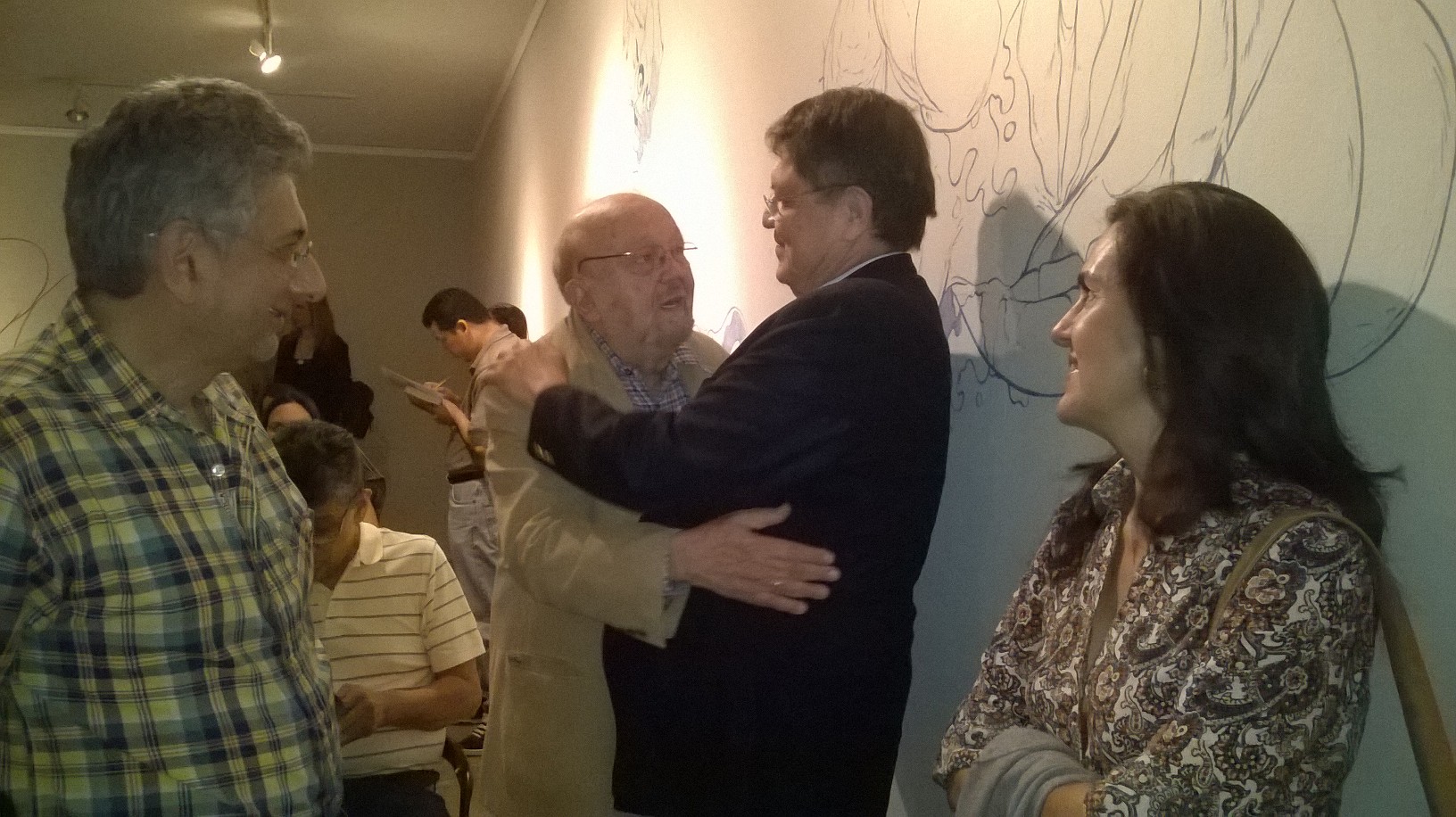 José Jorge Simán saluda a Ramírez Mercado. Aparecen también los escritores Róger Lindo y Jacinta Escudos.