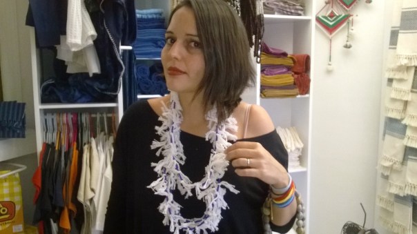 La diseñadora Lula Mena con uno de sus collares trenzados de algodón.
